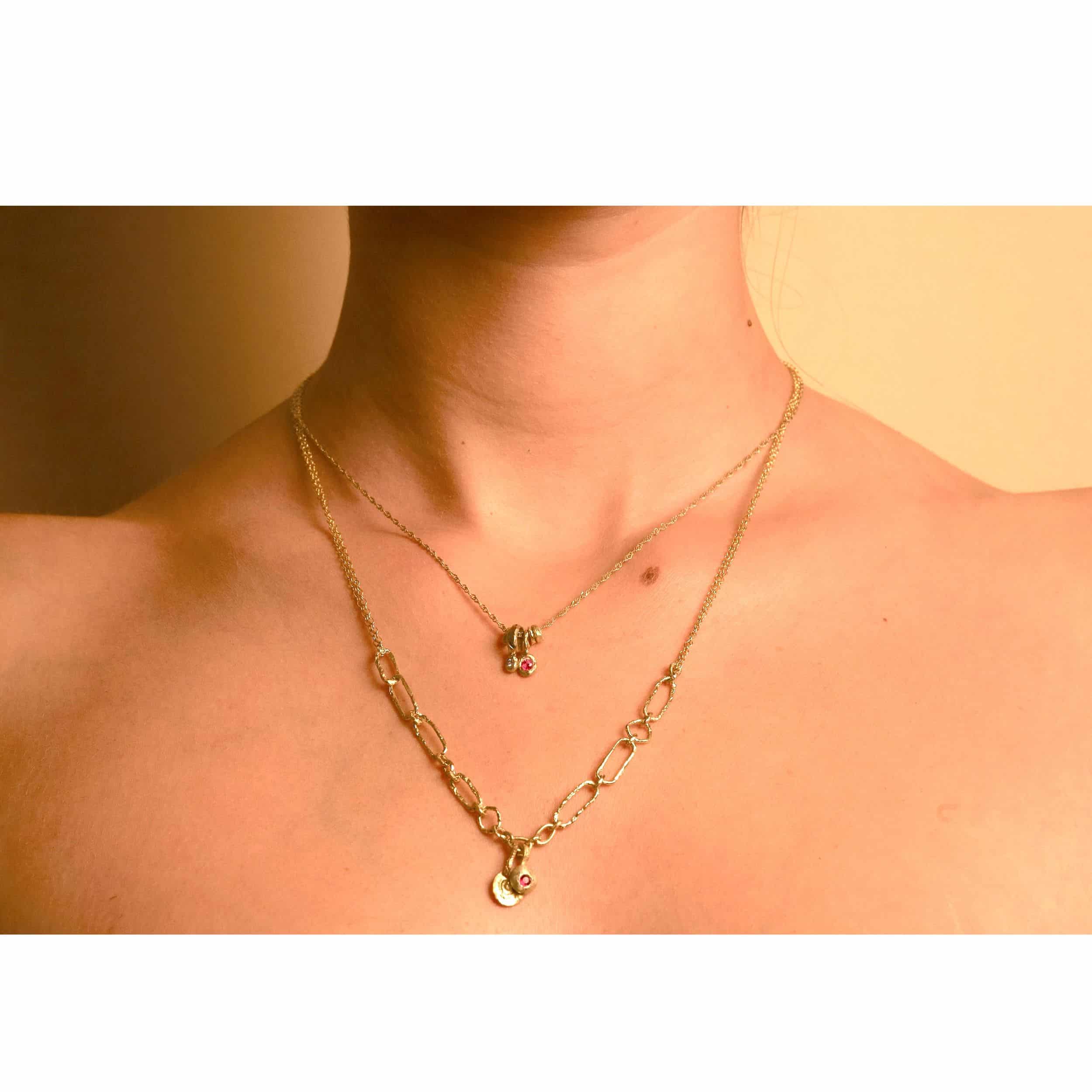 14K gold link necklace combined with a pair of spirals set with ruby