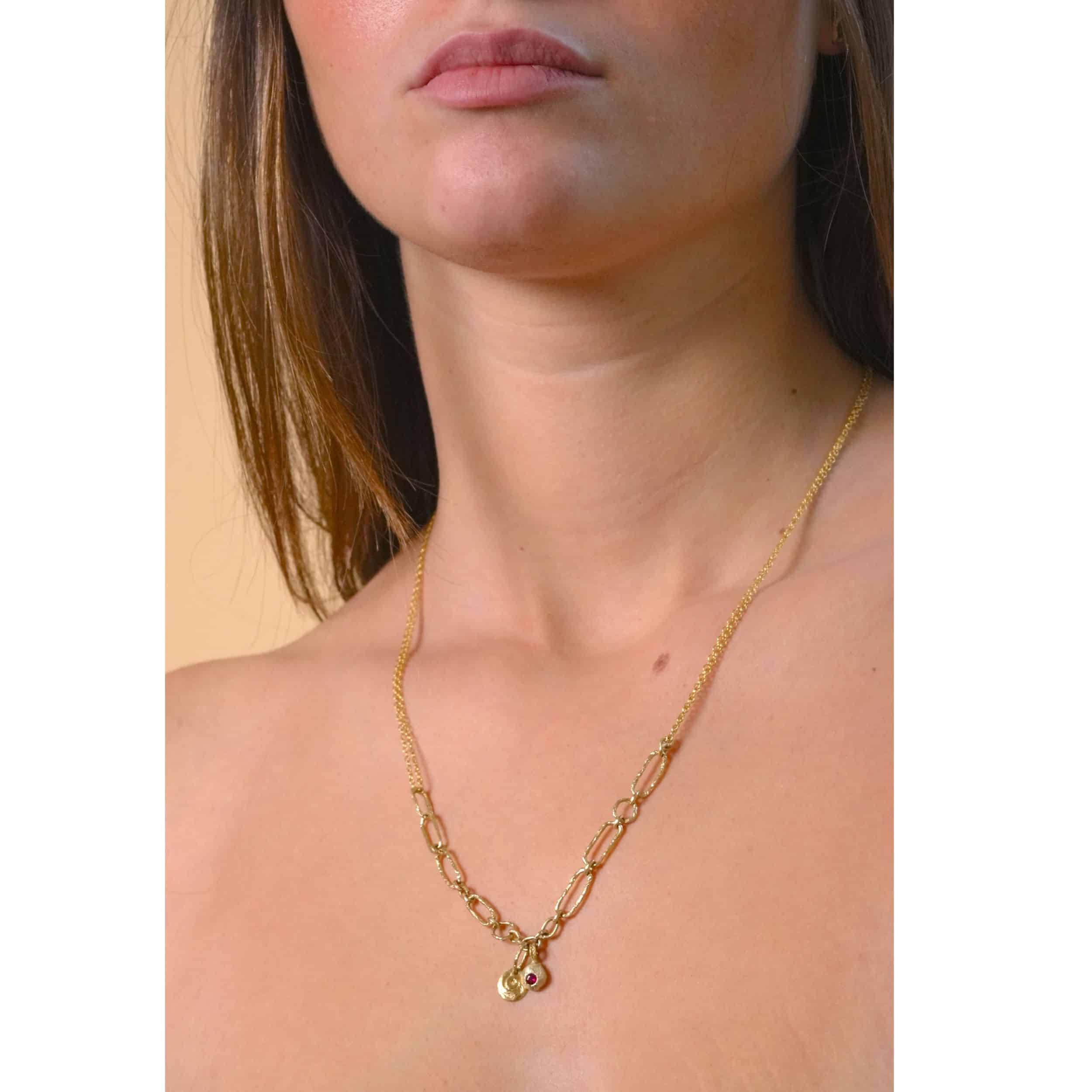 & Free ShippingA unique necklace composed of links in varying sizes, creating a natural rhythm between presence and delicacy. At its center is an organically shaped pendant set with a ruby gemstone and adorned with a subtle spiral that symbolizes life energy, movement, and renewal.